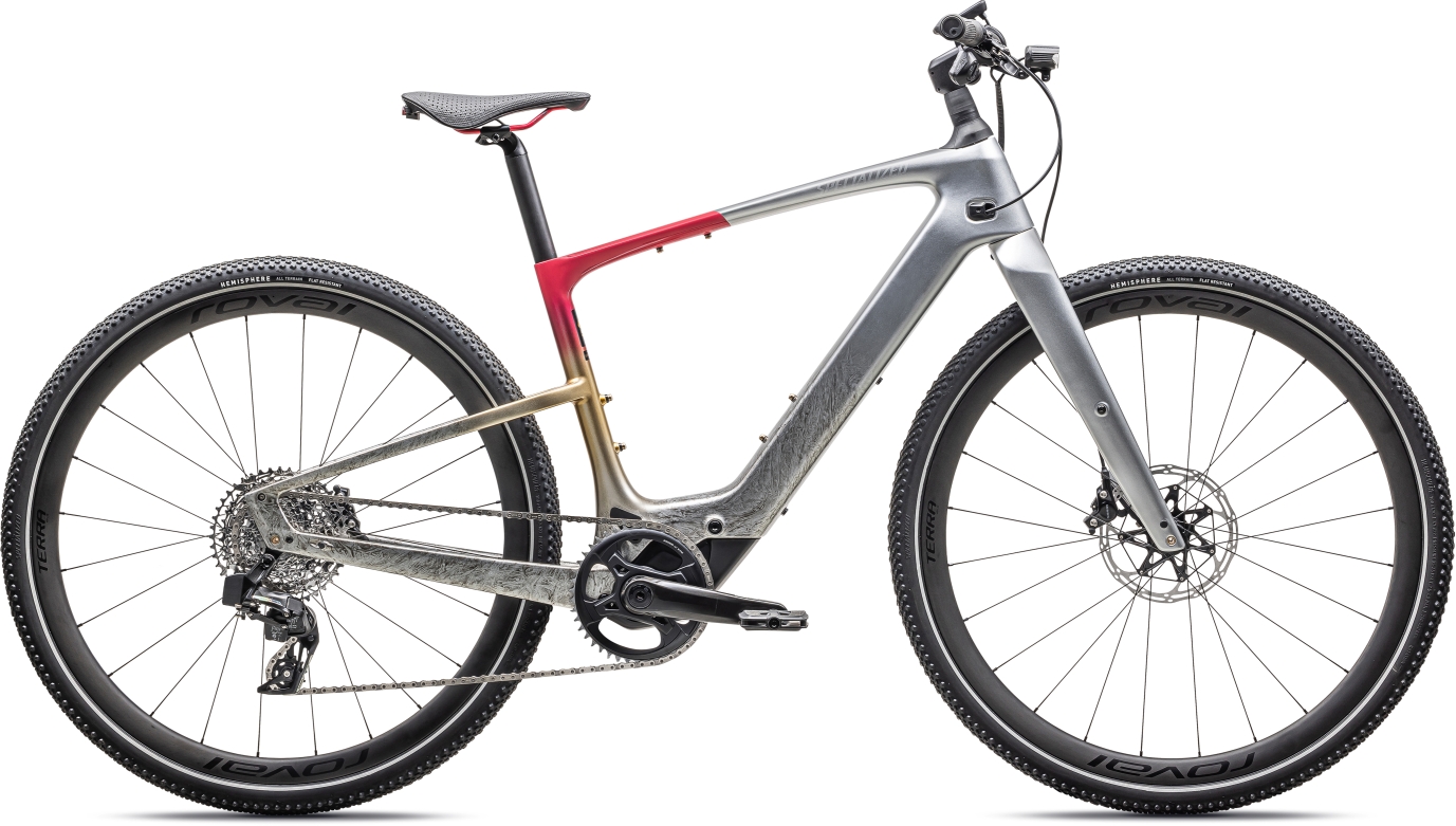 Sportovně laděné univerzální městské elektrokolo Turbo Vado SL 2, ve speciálním designu k 50. výročí Specialized, s ultralehkým karbonovým rámem, odpružením kokpitu Future Shock, lehkým elektromotorem SL s přirozenou podporou, karbonovými výplety Roval a bezdrátovou elektronickou sadou Sram Force AXS.